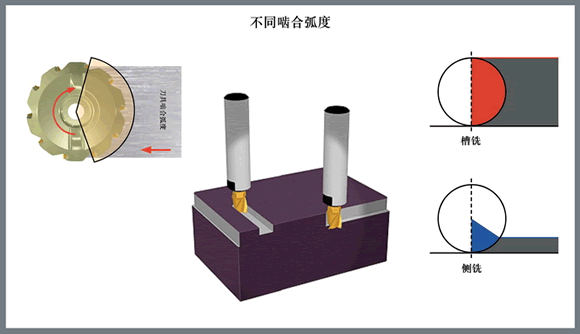 不同銑削工藝的嚙合弧也不同。例如在槽銑中,工件材料在加工過程中包圍一半的刀具;嚙合弧是刀具直徑的 100%。切削刃一半的加工時(shí)間都花在切削上,因此熱量迅速積聚。這種情況與側(cè)銑不同,在側(cè)銑中,任何時(shí)候都只有相對(duì)較小的刀具部分與工件嚙合,并且切削刃有更多的機(jī)會(huì)向空氣中散熱。