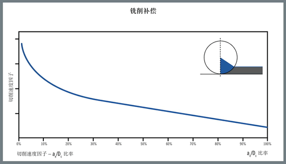 為了保持切削區(qū)內(nèi)的切屑厚度和溫度與刀具在滿刀切削時(shí)的值相等,刀具供應(yīng)商制定了補(bǔ)償系數(shù),用于在刀具嚙合量百分比減小時(shí)增加切削速度。